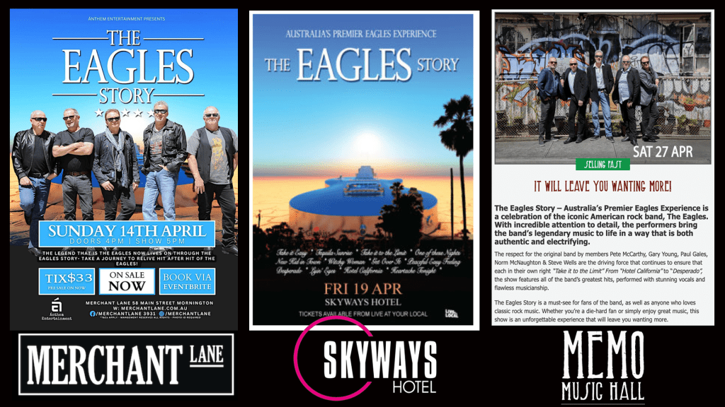 Welcome to 2025……. “The Eagles Story” are partnering with some great Live Music Venues and Theatres across Victoria and NSW to deliver the amazing songs from the EAGLES that shaped a generation and still stand the test of time.